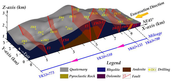 The dominating geological structures passing through the Daxiangling tunnel include two thrust faults and five compression torsion faults. Most faults tend to be northeast-southwest oriented, reflecting the control of regional structural patterns. As shown in Figure 4 and Table 2, we can observe the fine-detail information of all the faults, including specific location, occurrence, and type.