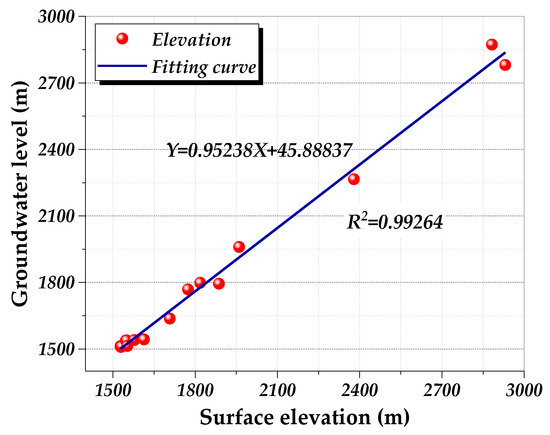Accurate acquisition of the initial groundwater level in the whole tunnel area is very important for the study of regional flow field. We need to assign the initial groundwater level of each unit. However, the actual initial groundwater level of the whole tunnel area cannot be obtained through drilling in-situ observation owing to the large area of the tunnel area. Therefore, the linear regression analysis of the groundwater level observed by drillings and the surface elevation at the location of drillings is carried out to obtain the initial groundwater level of the whole tunnel area. The relationship between the two elements is finally shown in Figure 7.
