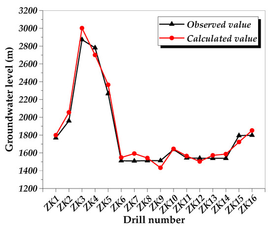 The correlation coefficient R2 of the linear regression results is 0.99264, which indicates that the correlation between groundwater level and surface elevation is very strong. Therefore, the approximately spatial distribution of the groundwater level in the whole tunnel area can be estimated with the fitting formula. In the process of model verification, the calculated values obtained by the fitting formula are assigned to each unit as the initial head of the steady flow simulation.