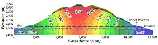 There is a groundwater divide formed in the middle of the tunnel and the initial regional water flow field is a hydrostatic pressure field before the tunnel being excavated. The groundwater level is 3235 m at the top of the mountain, above which drainage units appear (the patches refer to drainage units, which indicate that there is no groundwater). The distribution follows a linear law stating approximately that the level of groundwater decreases with the reduction of the elevation and the groundwater flows to both sides of the mountain while being recharged by the atmospheric rainfall, as shown in Figure 9.