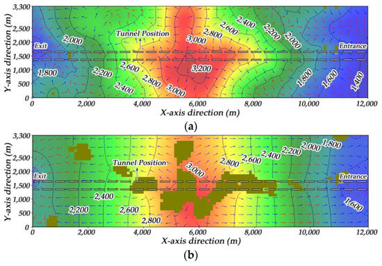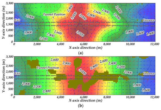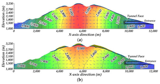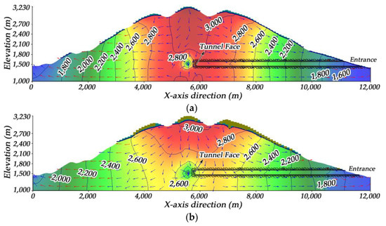 Tunnel excavating is rather influential on the regional water flow field. As can be seen from the profile map presented in Figure 10a, a groundwater flow channel is already formed and the groundwater divide moves towards the unexcavated area. The initial flow direction of the groundwater has changed with groundwater beginning to gush to the tunnel face. The contour of the groundwater head becomes dense around the tunnel face.