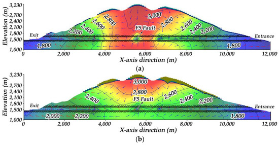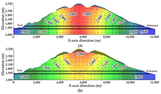 As the waterproof measures are applied, the range of the drainage unit on the mountain top is significantly reduced. The water head around the tunnel is obviously raised. When the tunnel is completed for 30 days, the groundwater in the high pressure area still flows to the tunnel. However, the distribution law of the regional water flow field is nearly the same as it in the state of nature after 360 days, as indicated in Figure 15a. The groundwater level rises apparently, and the regional water flow field reaches equilibrium quickly with the application of waterproof measures.