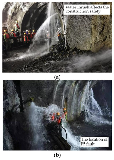 When the tunnel was excavated to YK62 + 133 mileage and YK58 + 510 mileage, the disaster of water inrush occurred in the excavation section. Water inrush seriously affects the normal construction of the tunnel and the safety of personnel. The situations of water inrush on the site are shown in Figure 16.