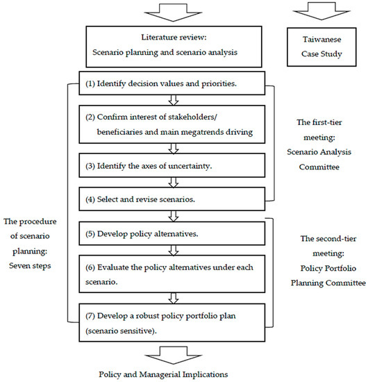 The purpose of a scenario planning procedure is to pair and coordinate scenarios with applicable policies. In our study, the scenario planning procedure included the seven steps shown in Figure 1: (1) Identify the decision values and priorities, (2) confirm the interests of the stakeholders and the driving forces of the main megatrends, (3) identify the axes of uncertainty, (4) select and revise scenarios, (5) develop policy alternatives, (6) evaluate the policy alternatives under each scenario, and (7) develop a robust policy portfolio plan. Steps 1–4 are conducted by the first-tier Scenario Analysis Committee, and Steps 5–7 are conducted by the second-tier Scenario Planning Committee.