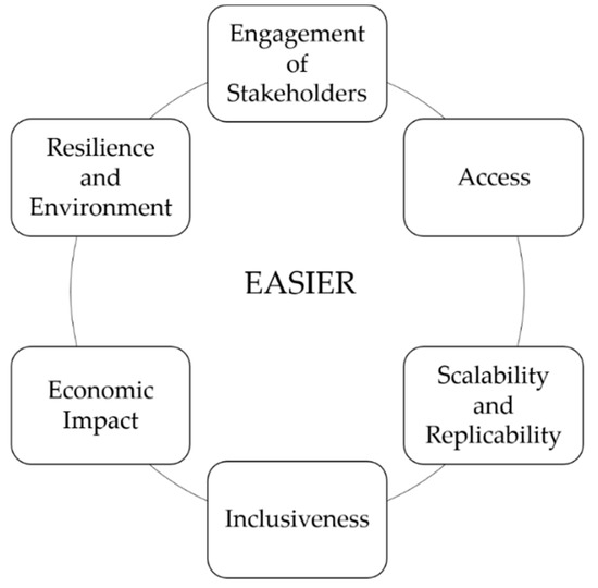 The EASIER conceptual model for an initial evaluation of public–private partnership (PPP) projects’ contribution to the Sustainable Development Goals (SDGs). Note: EASIER is an acronym that stands for the six dimensions of the model, which include the Engagement of Stakeholders; Access; Scalability and Replicability; Inclusiveness; Economic Impact; and Resilience and Environment.