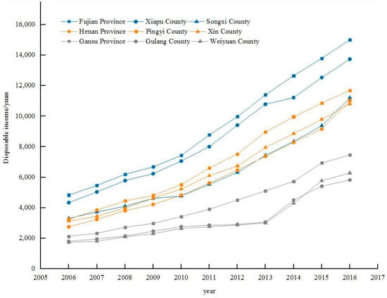 Per capita disposable income of rural residents in six sample counties and provinces. Source: According to the Statistical Yearbook 2017 of each county.