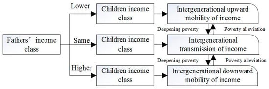 The population segment analyzed in this study was mainly the rural poor, whose income intergenerational changes mainly consist of three types: when the income of the father is fixed and the income of children is lower than that of parents, that is identified as the intergenerational downward mobility of income; when the income of children is higher than that of their parents, that is identified as the intergenerational upward mobility of income; and when the income level of children and parents is the same, that is identified as the intergenerational transmission of income, which is the most direct and fundamental manifestation characteristic of intergenerational poverty transmission (Figure 3). The research approach mainly employed the transformation matrix method, and it explained influence mechanisms using the logistic regression model of multiple classifications. For the selection of dependent variables in the regression model, upward income flow was taken as the reference group, and five indicators of livelihood capital were taken as independent variables. At the same time, the factors influencing downward income flow and income intergenerational transmission were observed. The main consideration was the downward flow of income, which indicates that the income of the descendants is lower than that of the parents, and that they are falling into the poverty trap, thus becoming a new generation of poverty. A deeper analysis of ITP, as well as an exploration of the factors of downward income flow, will lead to a more in-depth interpretation of ITP. The structure of the logistic regression model for multiple classifications is as follows: