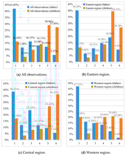 (1) The income levels of rural fathers and their children are noticeably different. Fathers had the highest proportion of lower incomes in our study observations, with this proportion exhibiting a decreasing “western–central–eastern” trend, while their children had the highest proportion of higher incomes, with this proportion exhibiting a decreasing “eastern–central–western” trend, coinciding with the gradient pattern of China’s economic development.
