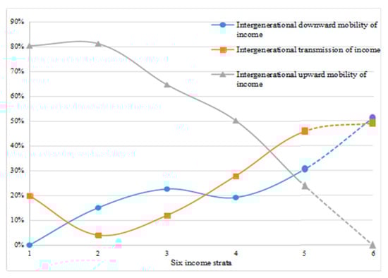From Table 3 and Figure 5, it can be observed intuitively that the intergenerational transmission of income across the entire observations group was higher in the high-income, middle–high-income, and low-income groups, and exhibited obvious intergenerational transmission characteristics of poverty. Specifically, the highest intergenerational transmission rate was 45.71% in the high-income group, followed by 27.83% in the middle–high-income group, and 19.84% in the low-income group. In terms of income upward mobility, the descendants of a particular income class exhibit an upward mobility trend that gradually strengthens from high income to low, indicating an increasing desire for upward mobility as income decreases. In the process of achieving upward mobility, the lower the income class is, the easier it is to achieve class spanning. Higher income groups, meanwhile, have a lower possibility of achieving class spanning. In terms of income downward mobility, the descendant income class shows a tortuous downward trend from the high-income to low-income groups. Among them, the descendant income downward mobility ratio of the high-income group was as high as 30.48% (not including incomes greater than 30,000 RMB). This reflects descendants whose parents were in the high-income level but, due to income retrogression, are likely to fall into the “poverty trap” and become a new “poor second generation”.
