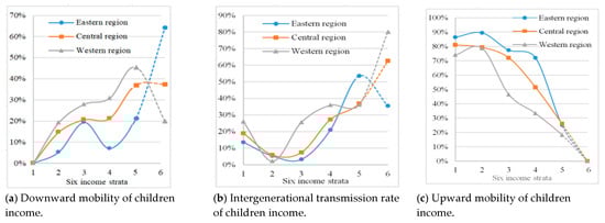 In terms of the intergenerational mobility of income (Figure 6a,c), the upward mobility rates of all income classes in the eastern region were discovered to be higher than the rates in the central and western regions, while the downward mobility rates of all income classes in the western region were higher than those in the eastern and central regions. This trend indicates that the higher the income level and the more developed the economy are, the higher the upward mobility of the children’s income class will be. The lower the income level and the more backward the economy are, the more significant the downward mobility of the income class of the children will be. The next generation will enter the struggle to eliminate poverty, making the transmission cycle of poverty from generation to generation longer and more difficult to eradicate.