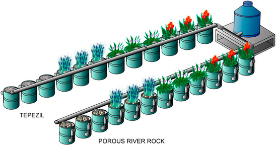 Constructed wetlands (CWs) are environmentally friendly technologies that have demonstrated high efficiency in removing pollutants from wastewater [1,2,3]. This sustainable ecotechnology is based on natural wetland processes for the removal of contaminants, including physical, chemical, and biological routes, but in a more controlled environment compared with natural ecosystems [1,4]. The success of these systems depends on various factors, such as the hydraulic retention time, tolerance of the selected plants to the wastewater, and the optimum porous media for microorganism growth [1,2,5]. The water pollution problems and the growing potential of this sustainable technology demands the need for the optimization of CW designs. Various types of CWs can be used for the exclusion of toxic compounds (superficial or subsuperficial flow) [1,5,6]. In particular, the systems with saturated bed (subsuperficial flow) are suitable for this purpose. However, the water presence favors anaerobic conditions, which inhibit biological processes, such as nitrification, that require mainly aerobic conditions. Improved nitrogen compound removal involves both nitrification (in aerobic conditions) and denitrification (anaerobic conditions) processes. In the fill-and-drain (FD)-CWs (also commonly known as tidal flow CWs), the bed is intermittently saturated, which is related to the fill and drain phases. Such systems are mostly applied when increased oxygen transfer is needed [6], but may also be used to promote anaerobic processes when the holding phase is extended. The shortcomings of the FD-CWs are that the conditions in the system are not constantly anaerobic as compared to, for example, upflow CWs. It is thus necessary to evaluate the viability of FD-CWs using ornamental plants for the treatment of wastewater. The vegetation in CWs is one of the most important features; the vegetation can improve the water quality mainly by absorbing pollutants from the water, and have rich belowground organs (i.e., roots and rhizomes) in order to provide substrate for attached bacteria and the oxygenation of areas adjacent to roots and rhizomes [7,8]. In tropical and subtropical regions, the most popular vegetation used in constructed wetlands are Phragmites australis (Common reed), species of the genera, Typha (latifolia, angustifolia, domingensis, orientalis, and glauca), and Scirpus (e.g., lacustris, validus, californicus, and acutus) spp. [8]. However, there are local ornamental plants (plants grown or maintained for its aesthetic features, like its color, fragrance, flower production, attractive pattern, or design, are called ornamental plants) that have not been tested for their ability to remove pollutants, even though ornamental plants represent an economic alternative for developing countries, where wastewater treatment represents a large expenditure of the municipal budget [9,10,11]. Another important feature in treatment wetlands’ design is the filter media. Some constructed wetlands are filled with expensive or uncommon materials as the substrate, such as zeolite [12,13], maerl (calcified seaweed) [14], wollastonite [15], shale [16], or cobbles [17]. However, in rural communities, where the economic conditions are deficient, it is worth taking into consideration the use of local materials and plants that have rarely been evaluated. Consequently, the main goals of this study were: (a) To examine the seasonal effect on growth and pollutant removal of different ornamental plants (Pontederia sagittata, Canna indica, and Spathiphyllum wallisii) with economical vision in the removal of pollutants using FD-CWs., and (b) to evaluate the use of different filter media (porous river rock and tepezyl) in the growth of plants and removal of pollutants in order to find the optimal design characteristics of constructed wetlands.