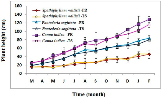The individual plant height change is shown in Figure 2. C. indica was the plant with higher growth than the other species, in both filter media. The maximum heights were 1.25 and 1.18 m in PR and TS filters, increasing almost 1 m of height during the study. Pontederia sagittatas howed lower increments in the height than C. indica. In both filters, the maximum height was 0.8 m, increasing almost 0.6 m from March 2015 to February 2016. S. wallisii plants grew up to just 0.22 m during the study in both filter media. In general, the adaptation of plants was good; the wetland conditions did not affect their survival, becoming an important feature for the use of plants in constructed wetlands.