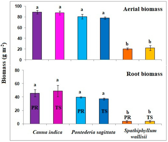 Effect of substrate media and plants on biomass production of different ornamental vegetation. PR = Porous river rock substrate, TS = Tepezyl substrate. Values are average ± standard error. Different letters indicate significant differences (p < 0.05).