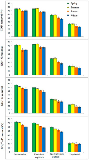 No statistic effect (p > 0.05) of the removal of pollutants was observed after comparing within climatic seasons by species (Figure 4). Stein and Hook [44] reported that the net effect of seasonal variation in water treatment in wetlands is greater in winter, because along the season, the plant-mediated oxygen transfer is affected by cold temperatures. This occurs mainly in temperate zones, however, in the tropical areas, such as this study, all the seasons were similar in temperature (26.1, 26.6, 25.2, and 20.3 °C in spring, summer, autumn, and winter, respectively). Also, DO and Eh in the water showed good conditions for the survival of microorganisms, and plant growth. Such conditions are important for the treatment of wastewater (Table 2). Allen et al. [45] only observed differences in the removal of pollutants in wetland microcosms when the temperature changed from 24 °C to 4 °C, changes not observed in this study.