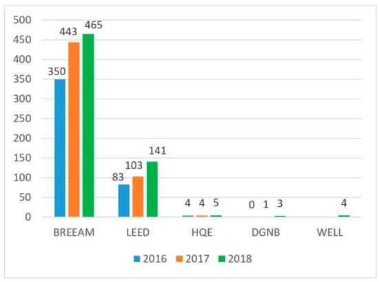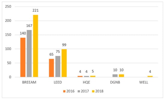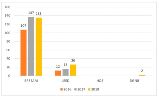 In order to indicate the degree of the application of building certifications in Poland and the popularity of the previously described BREEAM and LEED systems, the authors decided to analyze the number of certified buildings and certificates in the last few years (mainly in the period 2016–2018). The results of these analyses are presented in the next chapter.