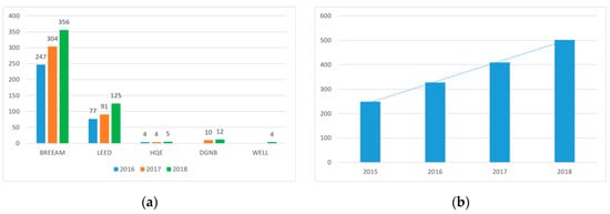 (a) The number of certified buildings in Poland in various systems from March 2016–March 2018. (b) The entire number of certified buildings in Poland, as of March 2015–March 2018. Authors’ own elaboration based on PLGBC data [36].
