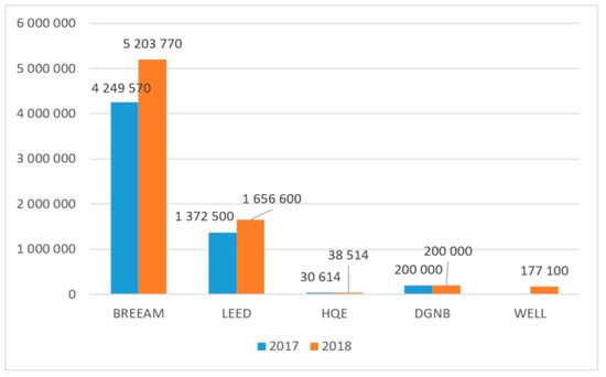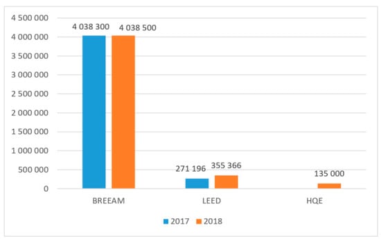 The total usable area of all buildings certified in all systems amounted to almost 12 million m2, of which the largest share belongs to those with the BREEAM certificate (Figure 5, Figure 6 and Figure 7) [36].