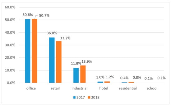 The share of the usable floor area of certified buildings by sector in 2017 and 2018. Authors’ own elaboration based on PLGBC data [36].