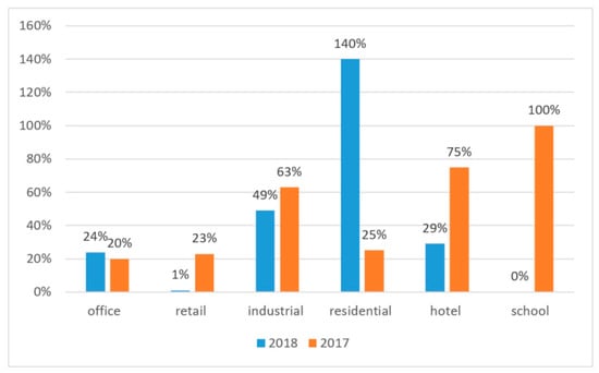 The dynamics of the annual increase in the number of buildings in particular sectors, presented in Figure 9, differs significantly in comparison to the previous year. The most spectacular increase in 2018 in percentage can be observed in the residential sector—about 140%. The office building sector grew at a rate of 24% (about 4% better than in 2017). The growth in the commercial sector was low, at the level of 1%. For comparison, in 2017 it was 23% [36].