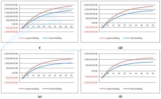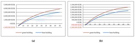 Formula (1) and the cost range given in Table 7 were used to calculate the LCC. Therefore, for the “green” building, the costs of the project documentation were increased to 7.9% of the construction works costs and an additional 3000 EUR was added as additional costs related to certification. The costs of implementation were higher by 8% compared to the base building. Operating costs were defined as 8% lower, while rent was 3% higher. The assumptions are presented in Table 7.