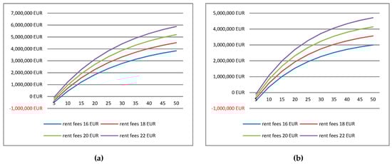 In the variant with a 4% rate of return, the LCC difference for extreme rent values after 50 years of use is 680,551 EUR, and in the variant with 7% it amounts to 424,947 EUR, that is about 60%. There is also a clear difference between the beginning of investment profitability for the different levels of rent. For the 7% interest rate, the profitability for the lowest and the highest rental rate is about 6–9 years, while for the 4% rate it is only 5–7 years.