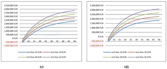 Further simulations concern the change of rent rates in the “green” building. The LCC was determined for rent fees 16; 18; 20; and 22 EUR, for r = 4–7% (Figure 11).