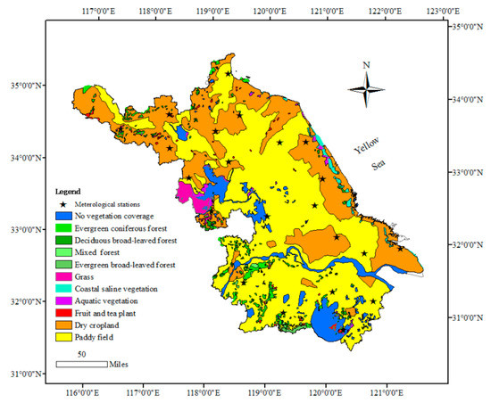 Jiangsu Province is located in eastern China, facing the Yellow Sea, within the longitudes of 116°18′ E–121°57′ E and the latitudes of 30°45′ N–35°20′ N (Figure 1). The economy in Jiangsu is considered strong within China, both historically and currently, and the gross domestic product (GDP) per capita is larger than that in the other provinces in China [47]. The annual temperature range is 13.6–16.1 °C, and the annual cumulative rainfall is approximately 1000 mm. A total of 85% of the terrain is plains with diverse vegetation types, and the natural vegetation includes evergreen coniferous forests, evergreen and deciduous broad-leaved forests, bamboo forests, grassland, and coastal saline vegetation, but these account for only 6% of the total regional area. There is a large area of crop vegetation covered in paddy fields and dry croplands, accounting for more than 80% of the entire regional area.