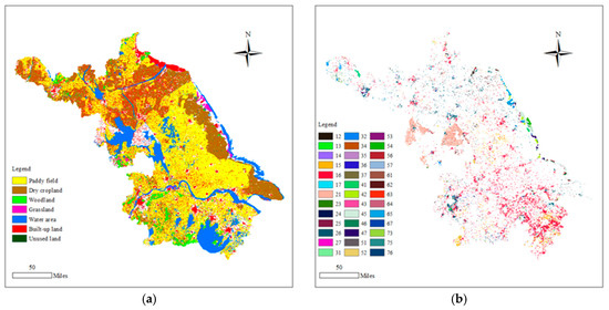 A total of 93.86% of land in Jiangsu exhibited the same land-use types in 2015 to those in 1995. The largest areas of the remaining paddy field were located across the entire province, especially in the central and southern areas. The unchanged dry cropland (i.e., cropland with no land-use type changes from 1995 to 2015) was mainly distributed in the north and east along the coastline. Woodland distribution appeared to be more obvious in the southwest and north. Grasslands were distributed along rivers and coastlines. However, for built-up land, it was more concentrated in the south than in the north (Figure 2a). Figure 2b shows that the converted land was distributed across the whole province, especially in the southern part and the regions near the coastal line. The transformed land in the south appears more intensive and concentrated, where the conversion of paddy fields to built-up land was mainly distributed. The transformation area of the coastline region was much larger than that of the land blocks because transformation from grasslands mainly occurred at the coastline region. The midwest area also showed a large intensive and concentrated transformation, with conversion from dry croplands to woodlands, and the northern area displayed more transformation from dry croplands than the southern area. The conversion from woodlands was mainly distributed in the south-western and northern areas of Jiangsu, while water area conversion was distributed across the whole study area. Conversion of built-up lands to other land-use types was distributed more substantially in the north.