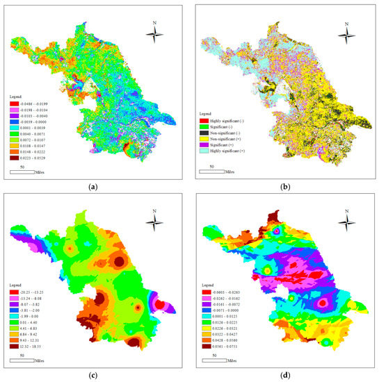 As shown in Figure 3a,b, from 2000 to 2015, mean annual NDVI changing trends varied between −0.0486 and 0.0529 among grids, and the mean value for all changes increased by 0.005 annually with a standard deviation of 0.0068. The area of the map with a decreasing trend accounted for only 17.57% of the whole vegetated area, with more area being distributed in the middle and south of Jiangsu Province. The highly significant decreasing and significant decreasing areas accounted for only 1.31% and 1.41% of the entire map, respectively. For the areas exhibiting increasing trends, highly significant, significant, and nonsignificant increases accounted for 26.05%, 15.15%, and 41.23% of the entire vegetated area. Highly significant increasing areas were mainly distributed in the north and northwest of Jiangsu Province, with significant and nonsignificant increasing areas being scattered across the entirety of Jiangsu. For the mean annual changing trend of precipitation and temperature (Figure 3c,d), none of the changing trends passed the significance test. Annual mean precipitation and temperature increased 4.76 mm and 0.009 °C per year, with standard deviations of 5.1 mm and 0.022 °C, respectively. Precipitation presented an increasingly dominant trend, the areas with increasing trends accounted for 87.65% of the entirety of Jiangsu Province, and the small amount of area with decreasing trends was located in only the northwest and southeast corners. For temperature, the area with decreasing trends accounted for 37.23% of the whole area, much larger than that of precipitation, and presented a wider distribution in the middle of Jiangsu.