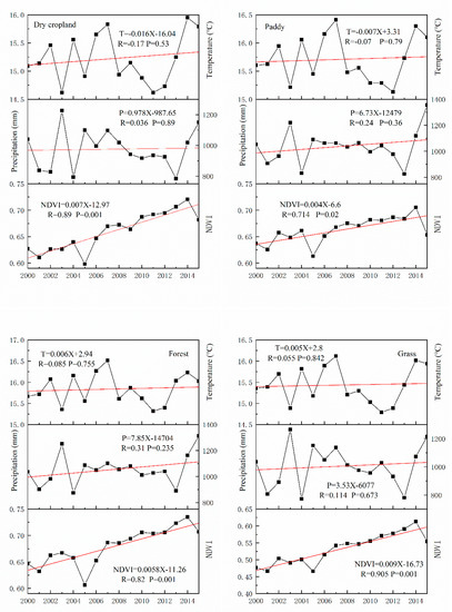Figure 4 presents the overall annual changes in NDVI, precipitation, and temperature for different vegetation types. The figure illustrates that the annual NDVI of dry croplands, paddy fields, forests, and grasslands all presented significantly increasing trends from 2000 to 2015, and all had P-values that passed the 0.05 significance test. Dry croplands, forests, and grasslands all passed the 0.01 significance test. The NDVI for different vegetation types presented similar changing trends, with the lowest annual mean NDVI values all appearing in 2005, and fluctuating increases from 2005 to 2015. For precipitation, it presented increasing for all vegetation types but nonsignificant changing trends, with all of their P-values being much larger than 0.05. The values fluctuated substantially among the different years and exhibited similar changing trends for all vegetation types, with the highest values appearing in 2003, while 2004 and 2013 were both troughs. For temperature, the fluctuations were even greater than those for precipitation. The general changing trend for dry cropland vegetation and paddy field vegetation presented a weak decreasing trend, while forests and grasslands exhibited a weak increasing trend, and the fluctuation trend among the different years were also similar for the four vegetation types.