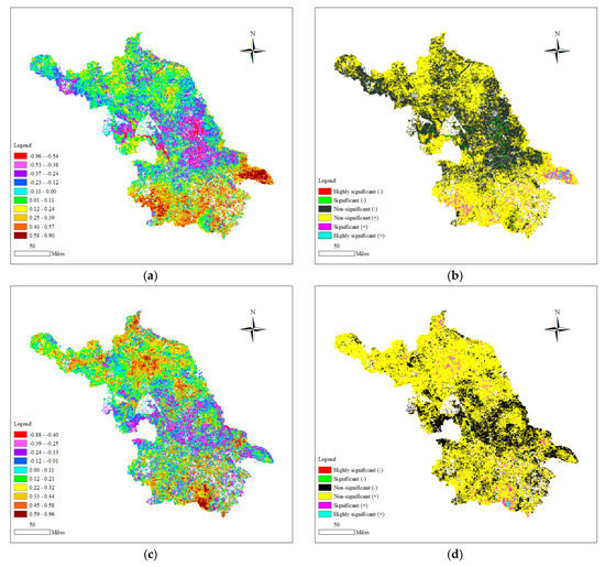 Statistically, both precipitation and temperature showed predominantly positive correlations (R) with NDVI for the whole area without land-use type changes (Figure 5a,c). The positively correlated areas accounted for 54.31% and 72.26% of the whole area and mean correlation coefficient values (R) of 0.028 and 0.147 for precipitation and temperature, respectively. All the negatively correlated areas presented mean R values of −0.22 and −0.17 for precipitation and temperature, respectively, while all positively correlated areas presented mean R values of 0.24 and 0.27, respectively. The P-value tests indicated only a small percentage of the areas passed the P > 0.05 significance test for both negative and positive correlations of both precipitation and temperature (Figure 5b,d). The negative and positive nonsignificant areas accounted for 44.36% and 51.35% of the whole area for correlations between precipitation and NDVI, and those percentages were 27.63% and 69.18% for correlations between temperature and NDVI. Spatial analyses show that the negative correlations between precipitation and NDVI were mainly distributed in the central and northwestern parts of Jiangsu, while the positive correlations were distributed in the south and north. The areas of negative correlation between temperature and NDVI significantly decreased compared to precipitation, which were still mainly present in central Jiangsu and presented a dispersed distribution among the positive correlations of NDVI in south Jiangsu. The positive correlation showed a wide distribution across Jiangsu, especially in the north, where there was a denser distribution.