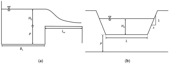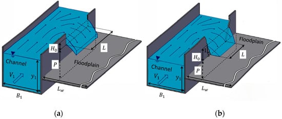 where,  is the Froude number based on the approach channel velocity ( and approach channel water depth (),  is the side weir height measured from the bottom of the channel to the crest of the weir,  is the bottom width of the weir, and  is the approach channel width. The detailed schematics for the variables are shown in Figure 1 and Figure 2.