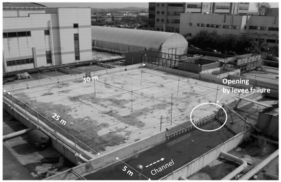 As shown in Figure 3, all of the experiments are conducted in a 30 m long by 30 m wide large outdoor basin at Korea Institute of Civil Engineering and Building Technology (KICT), Goyang, Korea []. Within the basin, lowlands 30 m long by 25 m wide are constructed for the inundation area. Along each side of the inundation area except one end, under-ground laboratory sumps are located to drain the water after passing the inundation area from the opening. Along one end of the basin, instead of constructing an under-ground sump, a rectangular-shaped straight channel is constructed to align with the lowland. The channel is 30 m long and 5 m wide and the width of channel is wide enough to avoid any influences of flow characteristics around the levee failure zone on the approach uniform flow section. The slope of the channel bed is horizontal, and the channel bed elevation is 0.4 m lower than the invert of the inundation area. The maximum flowrate is 1.0 m3/s supplied by pumps and the actual flowrate is measured by magnetic flow meters installed in supply pipe systems during the experiment. Water supply to the channel is recirculated such that water flows into the laboratory under-ground sump at the end of the channel from which the water is continuously pumped into the entrance of channel.