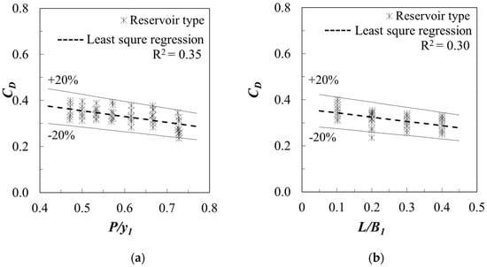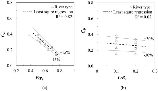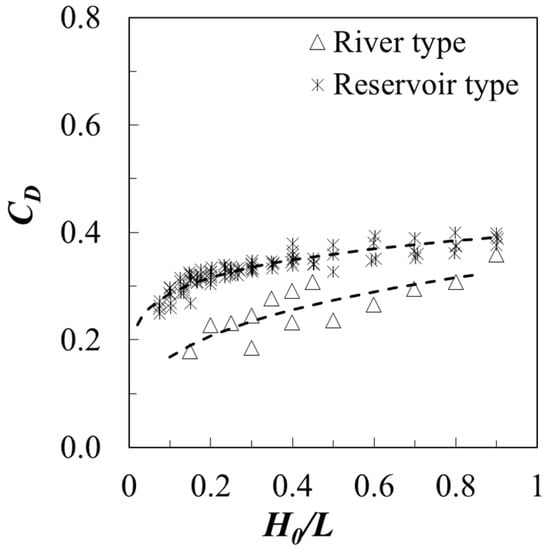 As shown in Equation (10), another influential parameter is H0/L. Thus, the measured discharge coefficients for both approach types are plotted in Figure 7 according to the values of H0/L. Based on the classical researches including Kindsvater and Carter [] and Bos [], there is a negligible influence of H0/L on discharge coefficient. However, as shown in the Figure 7, as the dimensionless variable, H0/L, in the x-axis increases, the value of discharge coefficient gradually increases. Thus, power function is used in the regression analysis and the results clearly reveal that the discharge coefficient has strong relationship with the value of H0/L for the reservoir type approach. For the river type approach, the value of CD increases as H0/L increases, but they are a slightly lower range than for the reservoir approach flow type. However, it seems that higher value of scatter can be found based on the value of coefficient of determination with respect to the regression line. Hence, it can be assumed that this preliminary results for the river type approach is over-simplified and additional variables should be considered for the analysis. This point will be discussed in next paragraph. The best-fit equation on the data given in Figure 7 is given by
