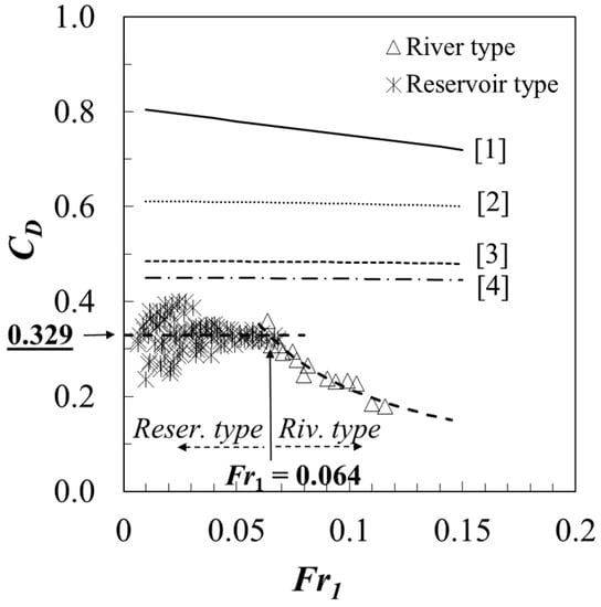 Discharge coefficient can be calculated by using Equations (12) and (14) applicable to a reservoir type approach and a river type approach, respectively. However, approach flow type for given conditions must be identified first to ensure that appropriate discharge coefficient formulas is used. Thus, to suggest the transition criteria, data in Figure 8 are examined further. As explained in the previous paragraph, the value of CD is independent of Fr1 for a reservoir type approach, and thus, varies from 0.23 to 0.4 in the lower bound of the x-axis in Figure 8. However, values of CD are aggregated as Fr1 increases and approached to arithmetic mean of discharge coefficient (=0.329); hence, it can be assumed that the value of CD at the transition from the reservoir type approach to the river type occurs at the value of CD = their arithmetic mean (0.329). Then, the regression line for the discharge coefficient of the river type approach is plotted in the figure. Figure 8 shows when the Fr1 < 0.064, the approach section can be considered as a reservoir type and the corresponding discharge coefficient formula is Equation (12); when the Froude number is larger than 0.064, the approach flow type is a river type, then Equation (14) should be used.
