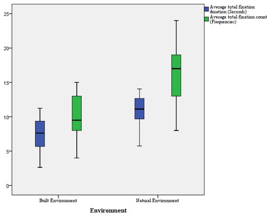 Customers’ visual attention to the natural images and the built images was also compared in a boxplot (Figure 2). The results showed that participants’ total fixation duration (mean natural images = 10.42 s; mean built images = 6.98 s, p < 0.001) and total fixation counts (mean natural images = 15.44 s; mean built images = 9.45 s, p < 0.001) for the natural images were longer than those for the built images. Hence, Hypothesis 1 is supported.