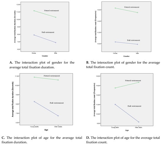 As shown in Table 2, regardless of gender, the average total fixation duration and average total fixation count of both males and females for the natural images were higher than those for the built images. Furthermore, as the interaction test showed, the effect of the interaction between gender and image characteristics on the average total fixation duration (FFixation duration = 0.071, p = 0.791) and the average total fixation count (FFixation count = 0.389, p = 0.535) were not statistically significant. Furthermore, based on the directions of interference effects on the interaction plot of gender (Figure 3A,B), the interactions between gender and the environmental characteristics for both the average total fixation duration and the average total fixation count are approaching two parallel lines. Hence, Hypothesis 2 is not supported.