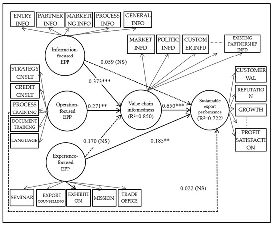 Following the validity tests on the measurement constructs, we performed an assessment of the structured model. Table 5 summarises the structural model tested via a PLS analysis. This table shows the explained variance (R2), the standardised path coefficient and the t-values produced with the significance level, applying the bootstrapping technique. It also presents the results with and without the mediating effects of value chain informedness to discuss the mediating role of value chain informedness within the relationship between EPP use and export performance over the longer term. With regard to the fully mediated model, the test findings support hypothesis H1a (β = 0.373, p < 0.01), H1b (β = 0.271, p < 0.05) and H1c (β = 0.170) for the different EPP types. This demonstrates that information- and operation-focused EPPs are positively associated with SMEs’ value chain informedness, while experience-focused EPPs are not. In terms of the direct impact of EPPs on export performance, information- and operation-focused EPPs do not show a direct impact on export performance, i.e., H2a (β = 0.059) and H2b (β = 0.022); while experience-focused EPPs had a direct impact on export performance, i.e., H2c (β = 0.185, p < 0.1). Finally, value chain informedness affects sustainable export performance positively; thus, H3 (β = 0.672, p < 0.01) is supported. Figure 2 illustrates the results of the impact path analysis of the fully mediated model.