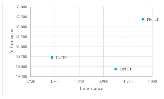We exploited the collected data set using PLS SEM, and then extrapolated the analysis to include an IPA matrix formulation by utilising SmartPLS 3.0 software. The scores we computed served as the basis for our analysis. The scores of the importance and performance for each EPP type are presented in Table 6. Experience-focused EPPs had the highest importance score (4.981), while operational-focused EPPs had the second highest (4.925), followed by information-focused EPPs (4.794). This implies that experience-focused EPPs’ performance scores should be the highest among the three dimensions. Experience-focused EPPs’ performance score was 62.386, which was indeed the highest, while information-focused EPPs’ performance scores came in second (60.464) and operational-focused EPPs’ performance ranked third (59.885). This indicates that the actual performance scores of operational EPPs and information EPPs are not consistent with their importance levels. As the operations EPPs’ importance level was higher than the information-focused EPPs’, the operational EPPs’ performance should be greater than the information-focused EPPs’. However, in actual fact, it is lower (59.885) than that of the information-focused EPPs (60.464). In other words, the performance of operational EPPs should be enhanced with more resource allocation according to the importance and performance levels. Figure 3 depicts the importance and performance scores of measurement variables.