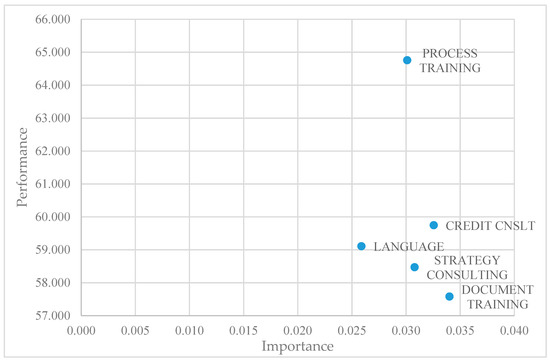 To identify which indicators of operation-focused EPPs may require resources to improve performance, the performance of the indicators was analysed. Table 7 lists the importance and performance scores of each indicator for operation-focused EPPs. Overall, every indicator except OPEP3 (training programs specialised in exporting processing) required more resources to enhance performance. In particular, we observed urgent resource requirements for DOCUMENT TRAINING (training programs on international documents). DOCUMENT TRAINING’s importance level scores equated to 0.034, so it ranked first among indicators, but its performance had the lowest scores (57.580). Based on its importance and performance level, we arrived at the idea that the priority in resource allocation should go to DOCUMENT TRAINING. Moreover, other indicators, such as STRATEGY CNSLT (Export strategy consulting), CREDIT CNSLT (Firm credit and financial consulting) and LANGUAGE (Export language counselling), required more resources to improve—their importance level was relatively high but their performance level was low. Figure 4 depicts the importance and performance scores of each indicator.