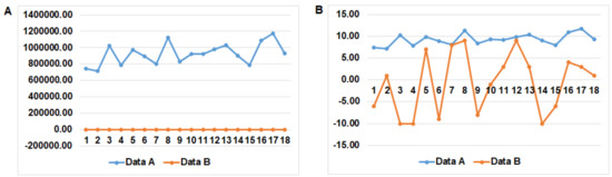 The importance of pre-processing: (A) raw data values; and (B) processed values using simple mathematical division. : Authors’ graphic representation using Office Excel.