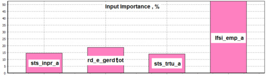One of the possibilities of data analysis, using Alyuda NeuroIntelligence, is “feature selection” which detects if inputs are useful and significantly contribute to the performance of the neural network. After an analysis using different types of methods (e.g., genetic algorithm), the user can decide if it is necessary to keep simulating with all the columns that were initially defined or to remove the ones that are less significant to the ANN processing. Even though the use of feature selection revealed the inefficiency of some columns (ANN considers each indicator as a column), for example the index of deflated turnover, the authors decided to keep all the data initially fed to the ANN. The reasons for this decision were: the diminishing of data columns would make the objective of the research less reachable and reliable and the authors wanted to determine the hierarchy of indicators as one of the objectives of the research.