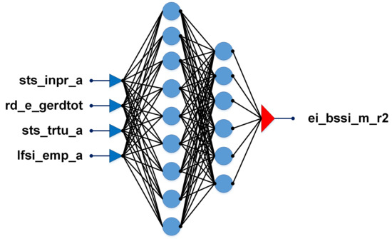 Considering the large number of areas where ANN is used, some of which are outlined above, the main goal of this research was to train an artificial neural network that is capable of forecasting the value of the next year’s sentiment indicator considering the present values of the above-mentioned four indicators. The choice of one year delay of sentiment indicator was necessary to overcome the consistent time delay that usually exists between the change in their sentiment/perceptions and the change in their investment decisions, as presented by Badea et al. (2018, p. 80) [13]. The sentiment indicator can be motivational for creating new services (Moraru, 2011, p. 128) [14] or industries having confidence in the regional or EU economy.