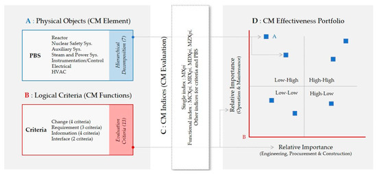 The CM assessment methodology proposed in this study evaluates seven physical elements of physical breakdown structure (PBS) Level I by using thirteen criteria as depicted in Figure 2. The seven physical elements include ‘reactor, nuclear safety system, auxiliary system, steam and power conversion system, instrumentation and control system, electrical power system and HVAC system’ as listed in the blue Box A of Figure 1. Further details of the physical elements are discussed in Section 3. The thirteen evaluation criteria in the red Box B of Figure 2 were developed based on the first group of variables (i.e., objectives, life-cycle and functions) in Table 1.