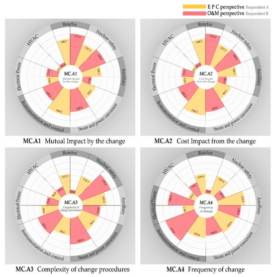 Firstly, the ‘mutual impact by the change (MC.A1)’ means the degree of a mutual change occurring between three CM properties (i.e., design requirement, physical configuration and facility configuration information) when a system changes. For example, when a part is replaced by engineering changes or by a failure, damage or performance degradation during operation period, it is required to check that technical and physical features of SSCs in the design requirement. Relatively higher degree of a mutual change made between design requirement, physical configuration and facility configuration information means importance of change management in the CM.