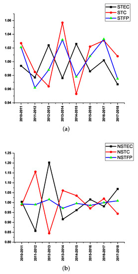 In Figure 1a, TEC, TC, and TFP are represented as STEC, STC, and STFP, respectively, for SBs. Figure 1a shows that TEC has more similar patterns with STF during the 9-year span, which indicates that the productivity of SBs is influence by TC rather than TEC. The analysis affirms that the bank’s capacity to accept changing external business environments can significantly affect its operating efficiency. Similarly, TEC, TC, and TFP are represented as NSTEC, NSTC, and NSTFP, respectively, for NSBs in Figure 1b. As shown in Figure 1b, NSTC and NSTF have different patterns, while NSTEC have similar patterns with NSTFP, which indicates that the bank’s efficiency is triggered by its own ability to use its resources through improvements in managerial practices.