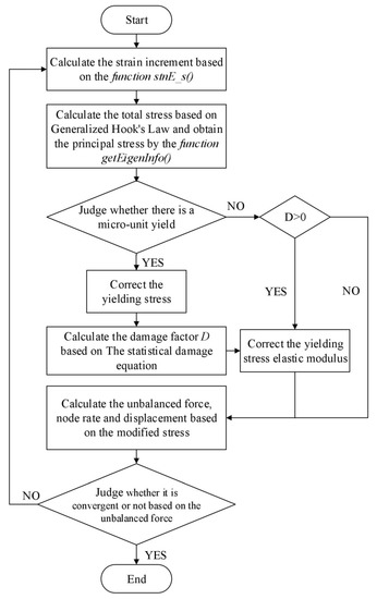 Based on the above analysis, a strain-softening constitutive model of heterogeneous jointed rock mass that considers statistical damage was developed, and the process of numerical implementation using software is shown in Figure 2.