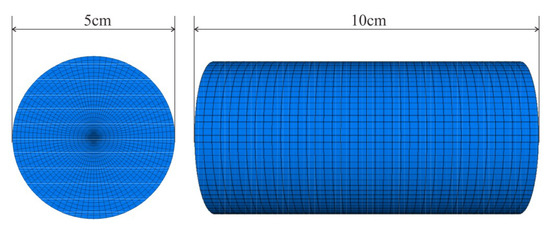 In order to prove the reasonability of the model, a uniaxial compression test was carried out based on the MC, SS, and SSD models. The numerical model, as shown in Figure 3, was established according to the actual standard size of rock specimens which is Φ 5 × 10 cm, and the parameters are set based on the values for marble shown in Table 1. The mesh has an inevitable impact on the results of the calculations—the finer the mesh is, the closer the result is to the actual value—but the trend of the calculation results is consistent. The meshes are divided based on the calculation efficiency and the accuracy of the result in this paper. The stain–stress–acoustic emission ringing counts curves are shown in Figure 4.