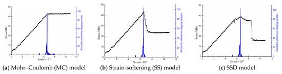 Figure 4a shows an ideal elastoplastic curve under the MC model—the stress increases as the strain increases until the yield strength is reached. Under the SS model shown in Figure 4b, the stress can be divided into three stages: monotonic increasing before the critical strain, decline, and basic stability. The yield stresses under the MC model and the SS model are almost the same—about 45 MPa. It can be seen from Figure 4c that the SSD model proposed in this paper can reflect the full process of failure for rock, especially the strain-softening property. The stress–strain curve is basically the same as the previous two in the elastic stage, except that the yield stress is slightly smaller. However, after the rock yield, a cliff fall appears because the statistical damage is considered. The damage on the weak part of the rock accumulates and the mechanical parameters are continuously reduced until rock failure, which explains why although the intact rock is very strong, the rock mass is destroyed along the weak structural plane during practical engineering.