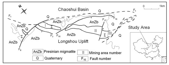 Jinchuan Mine, the largest nickel production base in China, is located in Jinchang City, Gansu Province. The ore deposit is about 6.5 km long, 200 m wide, and over 1000 m deep. It is a large and complex deposit with high ground stress, deep buried ore bodies, and broken rocks. The engineering geology of this area is shown in Figure 5. Due to its extremely complex regional geological background, special engineering geological environment, and distinctive rock mechanics, Jinchuan Mine has attracted the attention of scholars and experts at home and abroad. With the mining depth increasing, the safety of deep roadways has become a prominent problem in the Jinchuan mining area [35,36,37].
